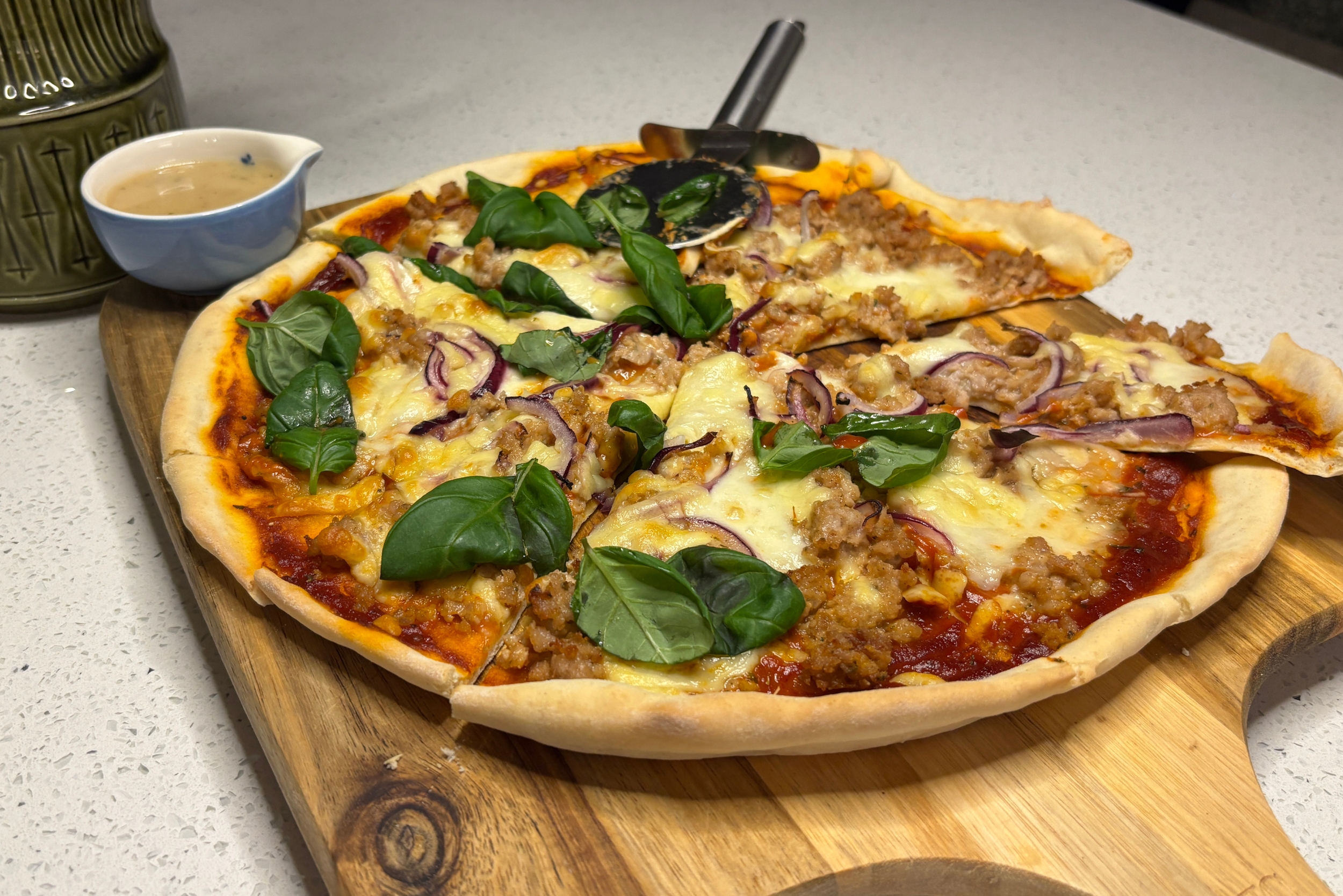 - Scatter over the mozzarella for the classic cheese pull, followed by the sausage pieces and red onion. Finish with the cheddar (optional) for that golden top.